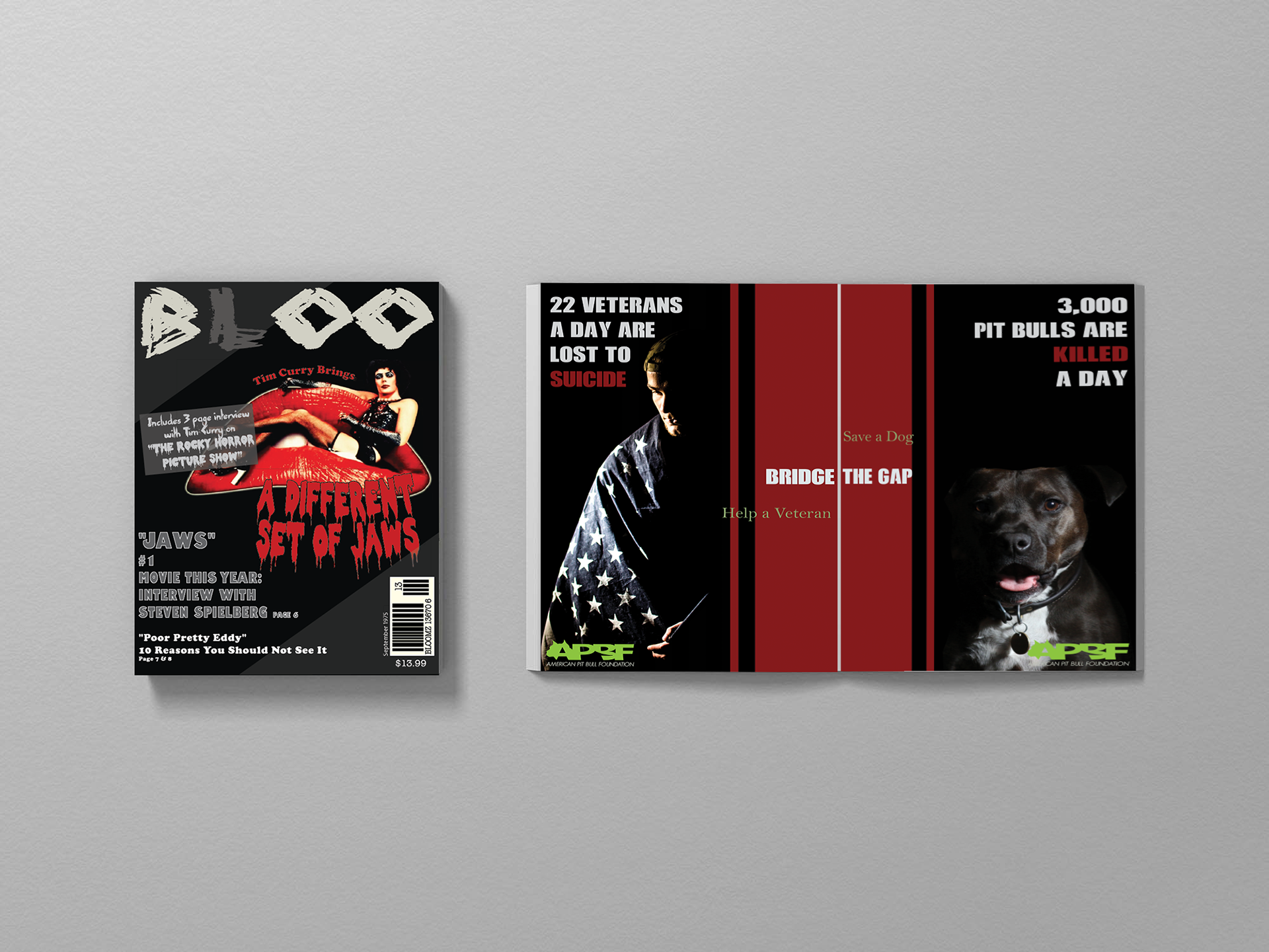 BlOO magazine cover was born from my love of 1970s horror movies and the gimmicky nature of them. The insert was a part two of sorts to the cover. The assignment was to create an insert for the magazine.