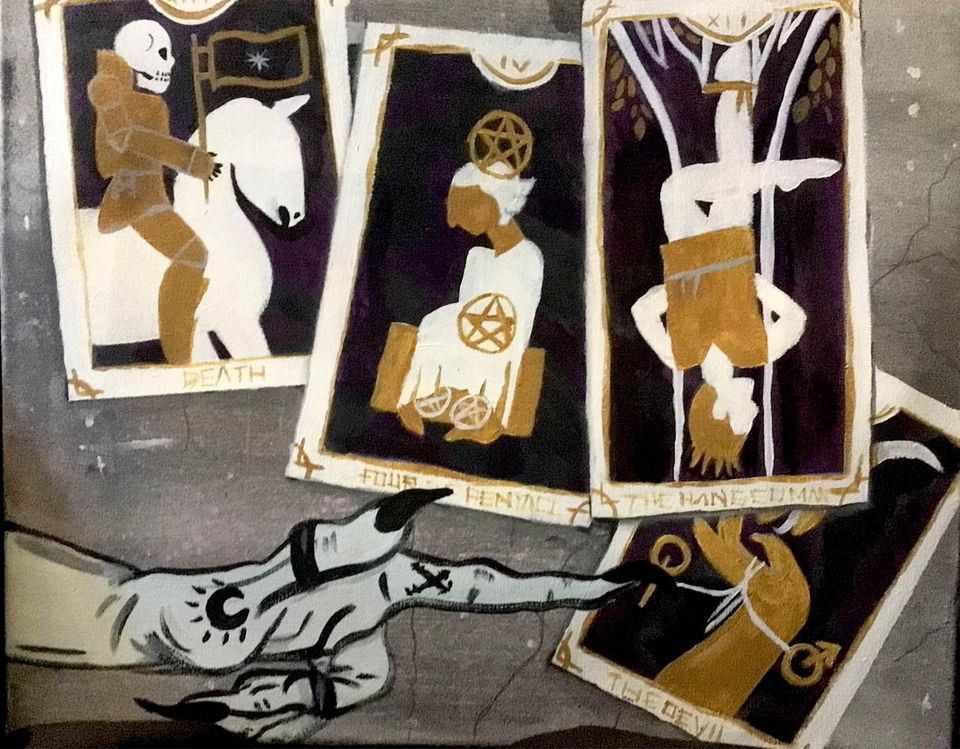 This work is acrylic on canvas created to symbolize my emotions in 2019. The cards are based on designs by
