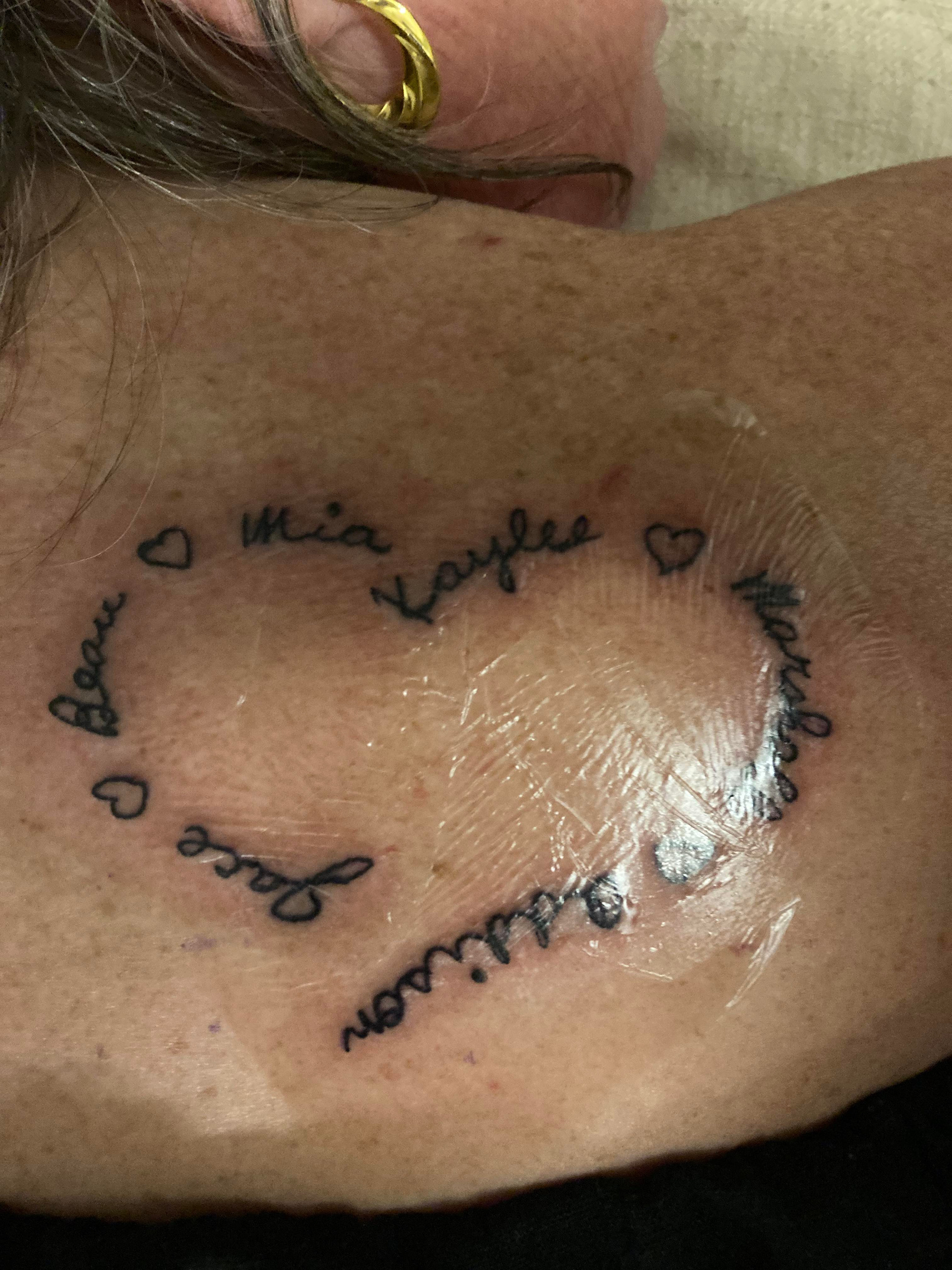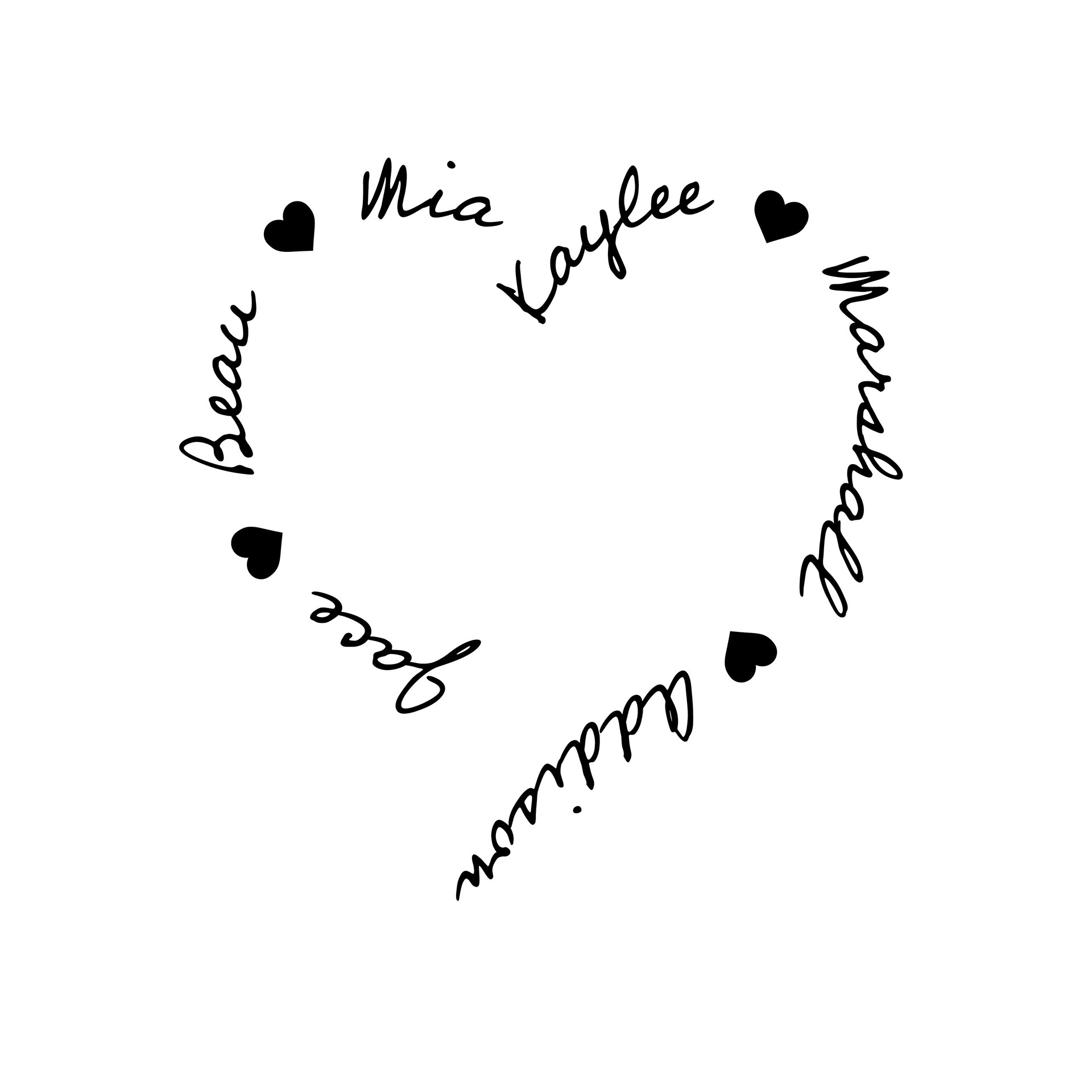 Melinda wanted a design that captured the love she has for all her grandchildren. Together we created a heart where the names form it with smaller hearts separating the names.