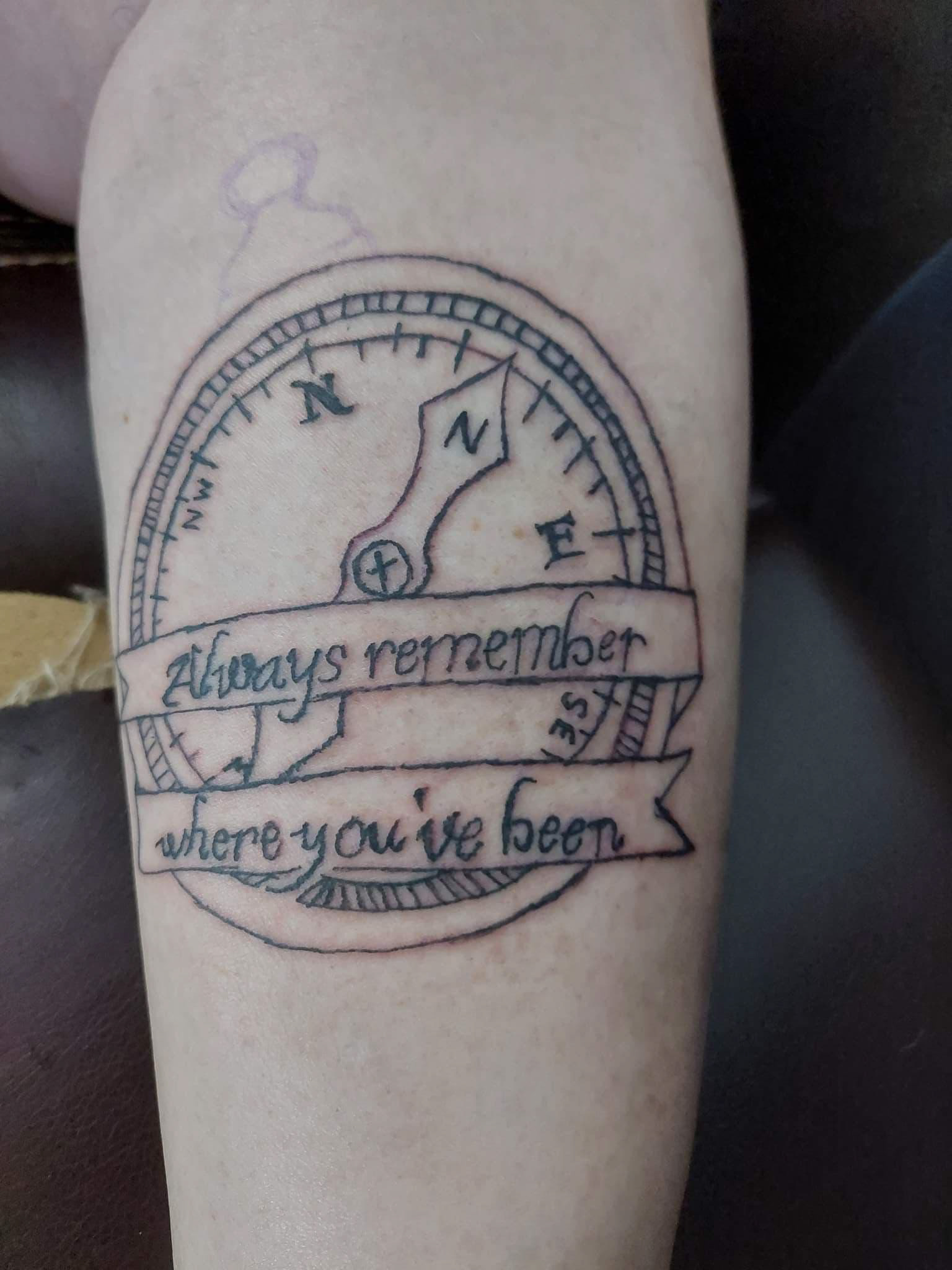 John wanted a design that reminded him to look back at the past and learn from it. This design was created to remember his friend who had passed in 2021.