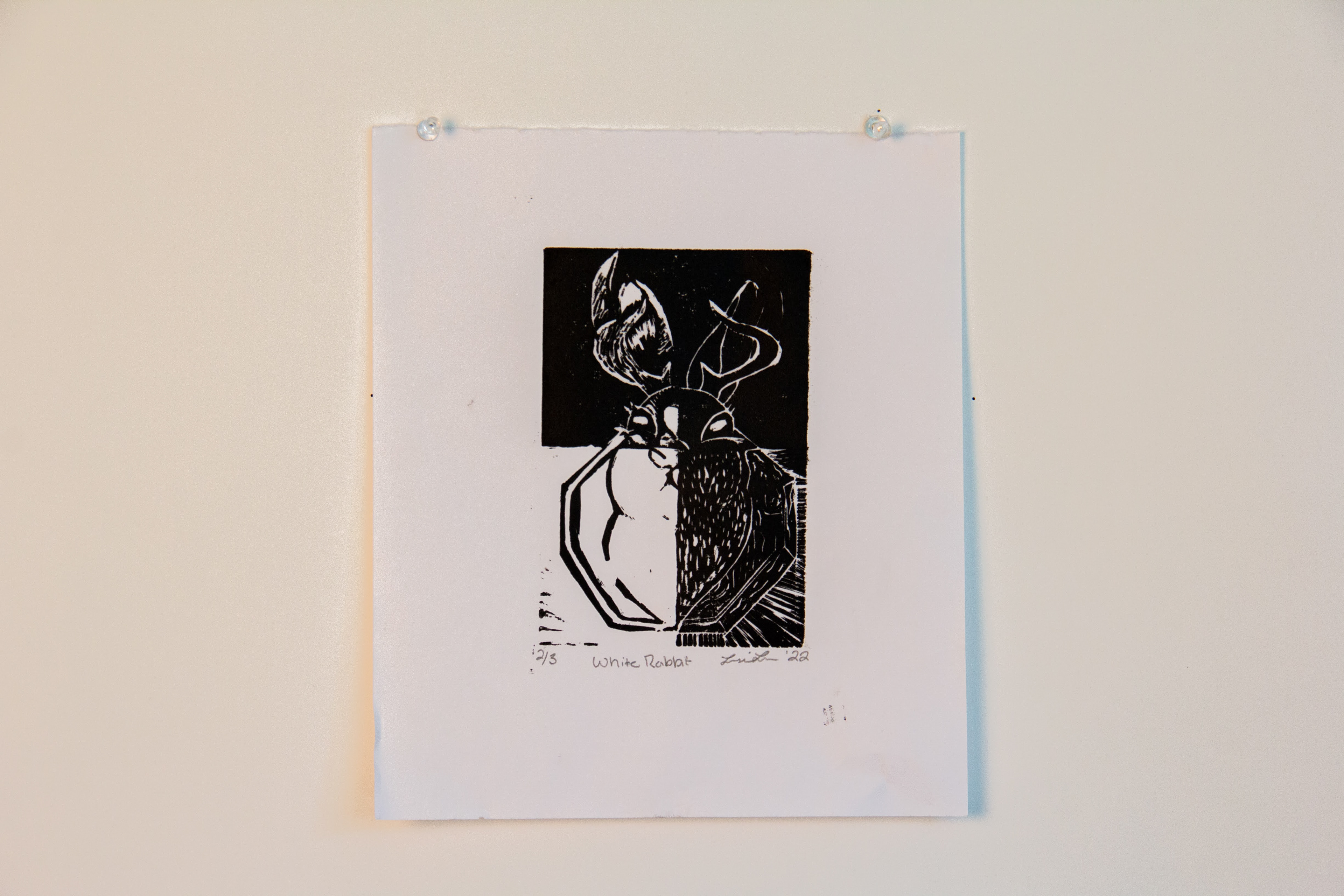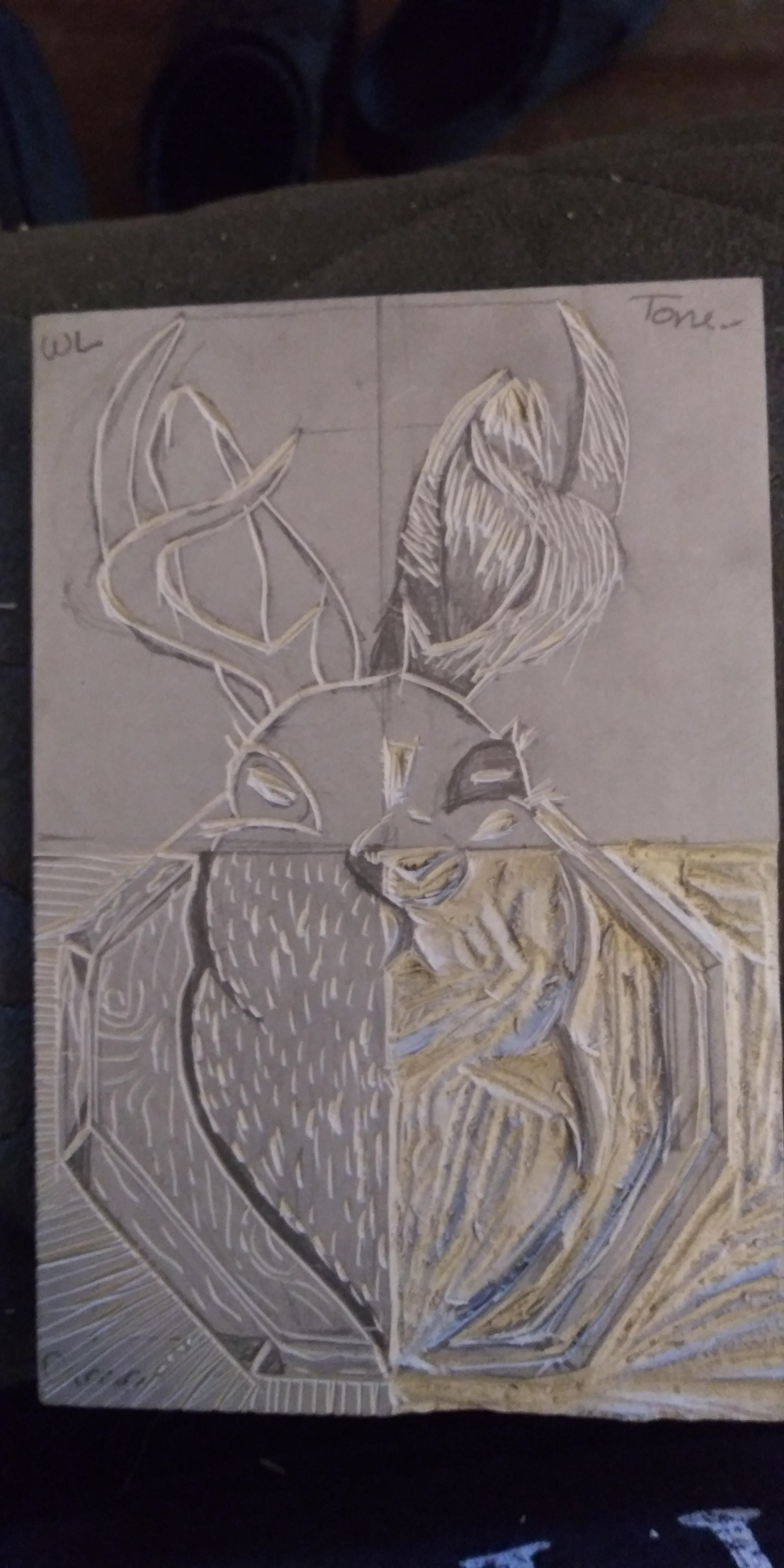 This work explored four different carving techniques: tone, white line, black line, and directional.